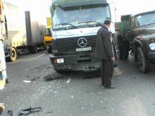 На Большой Окружной дороге возле Борщаговского рынка, по направлению к проспекту Паладина, практически напротив Т-образного перекрестка - выезда с боковой второстепенной улицы на Окружную, во втором ряду столкнулись два «тяжеловеса». Грузовик Mercedes догнал такой же грузовик Renault Magnum, сообщает .