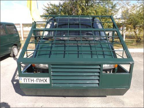 Это уже не первый опыт бронирования старых VW T4 - предприятие уже готовило два таких фургона, и они уже ездят в зоне АТО. На сей раз решено было немного облегчить конструкцию. Кузов обшит 3-мм статью, а вот передняя "маска" немного видоизменилась. Вместо сплошного 5-миллиметрового листа на ветровое стекло, установлены решетки. Такое решение разгрузило "передок" Transporter и улучшило обзорность, но он по-прежнему может штурмовать заросли и кустарники. также сохранена защита двигателя.