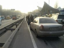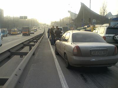 Образовалась большая пробка от моста Патона в сторону Московской площади. Блокирована левая полоса движения. Усугубляется движение также большим количеством маршруток возле метро. Для движения остались свободными только две полосы из четырех.