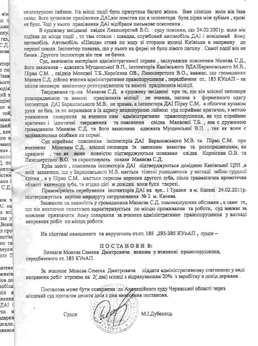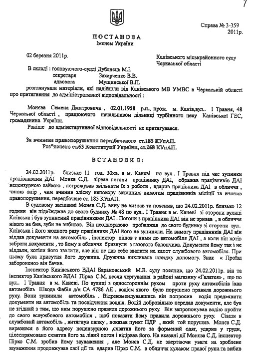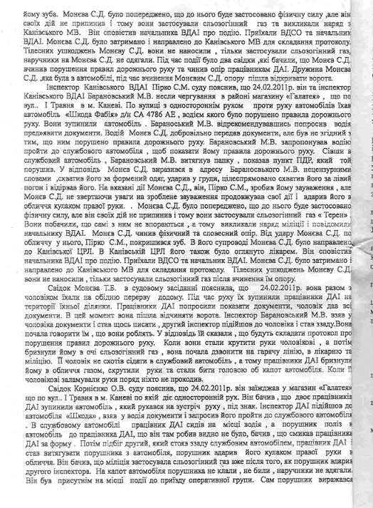 После оказания первой мед. помощи окулистом в Каневской ЦРБ, я был этапирован в милицию, где в течении 4-х часов меня допрашивали и к 17-00 отвезли в суд. Перед началом заседания мне были возвращены документы, предъявлен акт нарушения ПДД. На суде были предъявлены обвинения в избиении работников ГАИ. Судья перенес заседание на 9.03.2011 из-за отсутствия свидетелей.