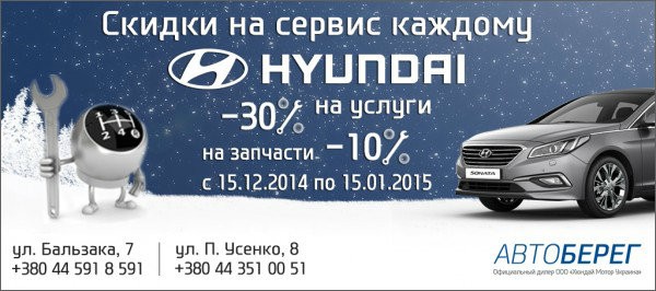 В честь наступающего Нового Года компания "Автоберег" объявляет о старке скидок на сервисное обслуживание и запчасти на СТО. C 15 декабря 2014 г. по 15 января 2015 г., при посещении станции технического обслуживания компании "Автоберег", каждый владелец автомобиля HYUNDAI имеет возможность получить скидку -30% на работы и -10% на запчасти! Подробнее в автоцентрах HYUNDAI компании "Автоберег" по адресу: ул. Бальзака 7 и ул. П.Усенко 8. .