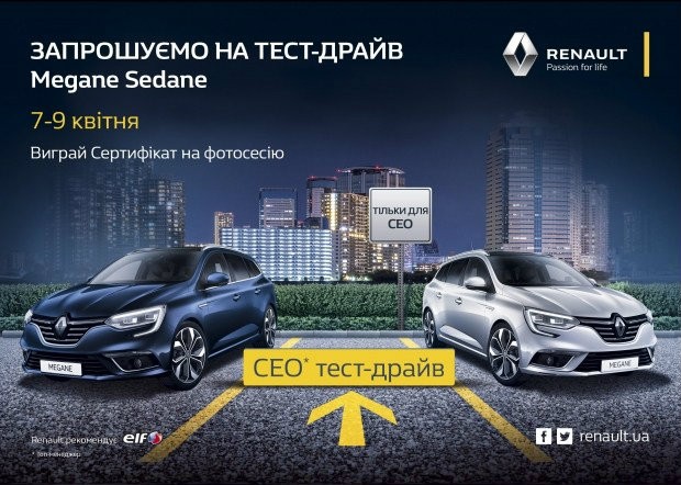 - Пройти тест-драйв нового автомобиля Renault Megane седан и принять участие в розыгрыше фотосессии*;