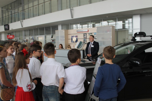 Встретил гостей начальник отдела продаж, который начал вести экскурсию по автосалону и рассказывал об организации работы в отделе продаж и автомобилях.