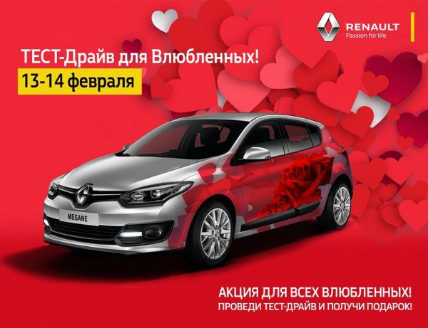 Приходите в наш Автоцентр с 13 по 14 февраля, испытайте автомобили renault с французским шармом и норовистым характером и получите праздничный Подарок!