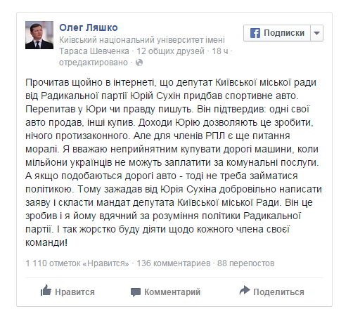 Мы опубликовали снимки новых автомобилей Сухина, упомянув принадлежность к партии Олега Ляшко. Он то и заинтересовался этим постом, после чего обратился к своему соратнику…
