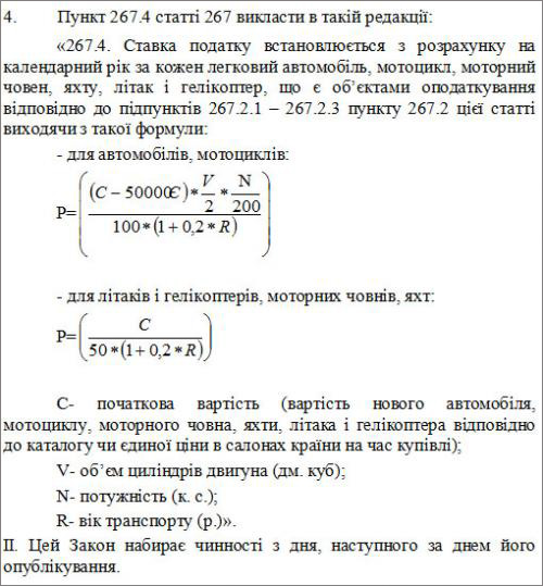 Народный депутат Барна О.С. (в прошлом учитель физики из Чорткивского района Тернопольской области) решил увековечить свое имя и вывел целую формулу налогообложения автомобилей. Правда, подставлять данные туда нужно не в стандартизированных единицах измерения: объем - в кубических дециметрах, мощность - не в киловаттах, а в лошадиных силах. Но самое интересное, что нужно отыскать и первоначальную стоимость авто, даже если ему 30, 40 или 50 лет.