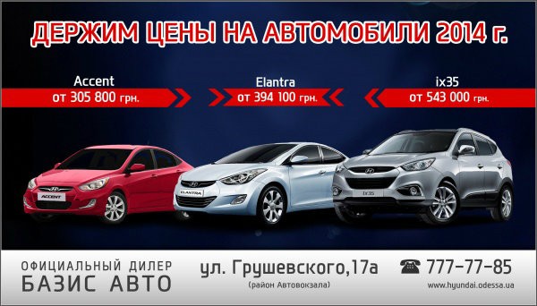 * Предложение действует в официальном дилерском центре в Одессе ДП "БАЗИС АВТО" с 5.02.2015 г. На автомобили Hyundai 2014 года производства. Детали уточняйте у консультантов. Цены с НДС по состоянию на 05.02.2015. Продавец имеет право без предварительного согласования изменить цены на автомобили. Количество автомобилей ограничено.