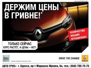 Только сейчас курсовая разница дает возможность приобрести автомобили Renault, по ценам, зафиксированным в гривне, с дополнительной скидкой до 12%!