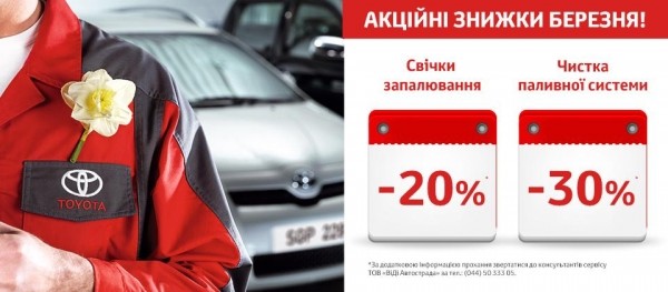 С 1 по 31 марта 2016 года все клиенты Тойота Центр Киев ВиДи Автострада смогут воспользоваться специальными сервисными предложениями, которые призваны дать каждому клиенту возможность получить качественный сервис по приемлемой цене.