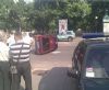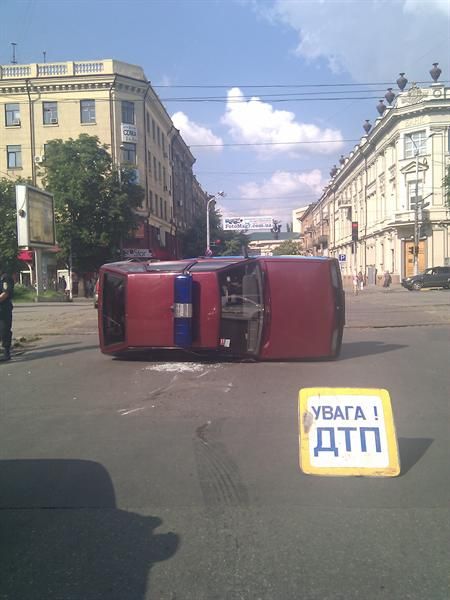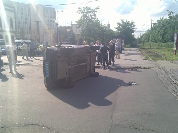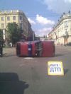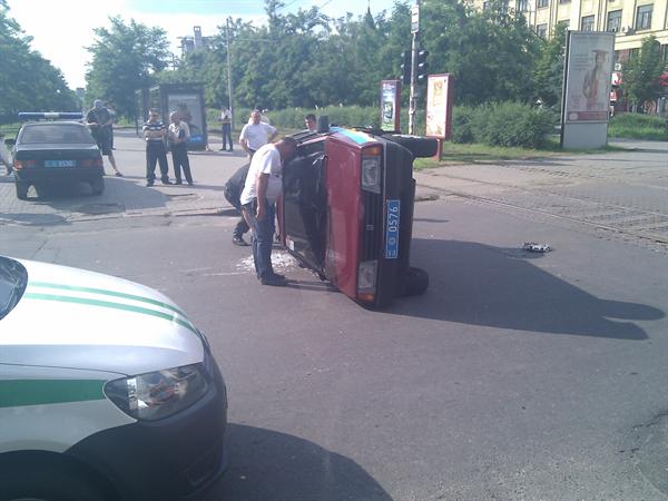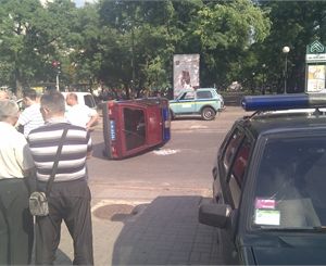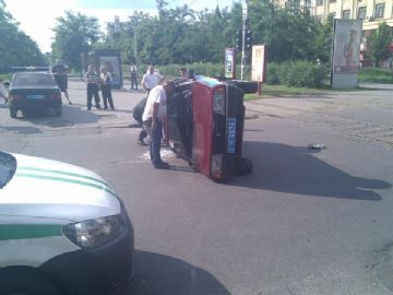 Не успев затормозить, авто врезалось в бок машины ГСО, отчего ту перевернуло на бок и отбросило в сторону. К счастью, сильно никто не пострадал. В иномарке на заднем сиденье ехала маленькая девочка, но с ней все в порядке. Один из сотрудников ГСО получил легкий ушиб головы. На месте происшествия работают специалисты из ГАИ и милиции.