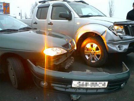 В результате такого резкого маневра в передний бампер Renault въехал новенький Nissan Navara. Оба автомобиля застрахованы. Люди, к счастью, не пострадали. А вот сами автомобили пострадали существенно: «изысканно оторванный бампер Renault валяется неопрятной кучкой на асфальте».