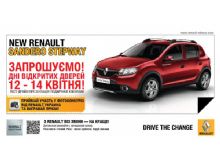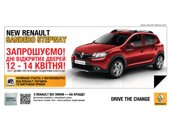 Воспользуйтесь возможностью, в период ДНИ ОТКРЫТЫХ ДВЕРЕЙ модели NEW Sandero Stepway принять участие в конкурсе от АО «Рено Украина» и выиграть призы*!