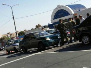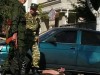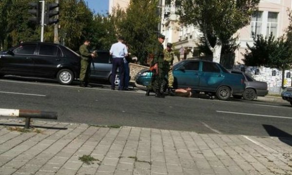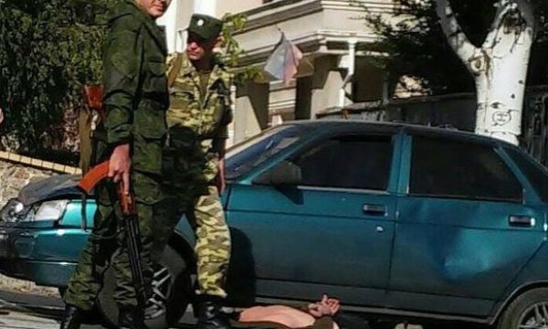 Кроме того, рядом с одной из машин лежит мужчина с заложенными за спину руками.