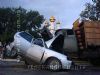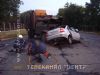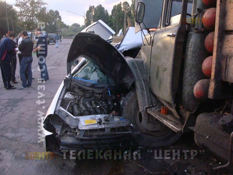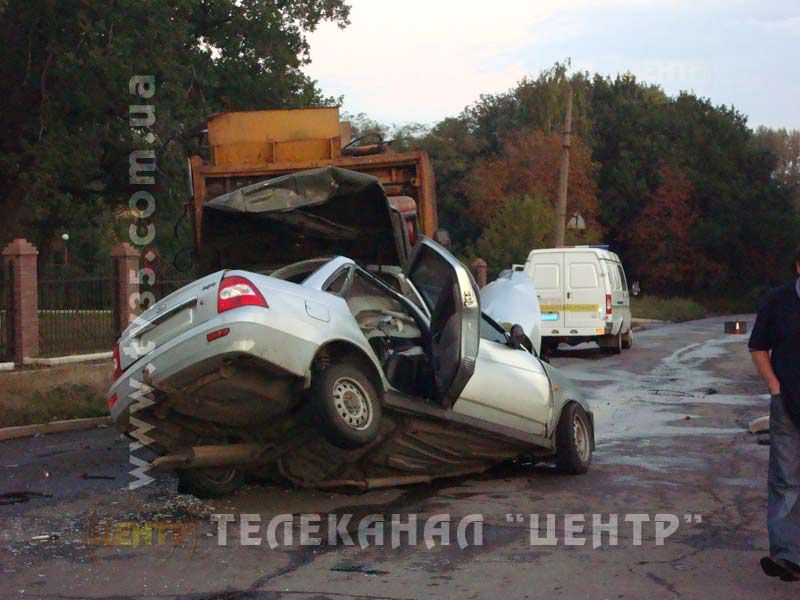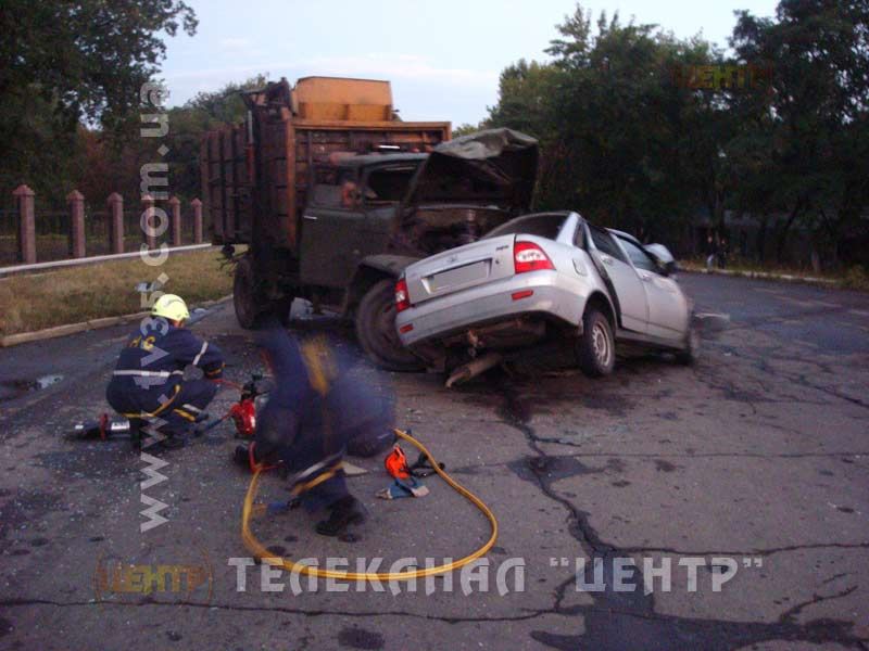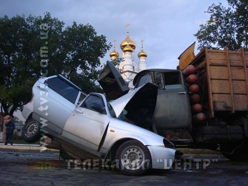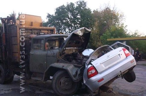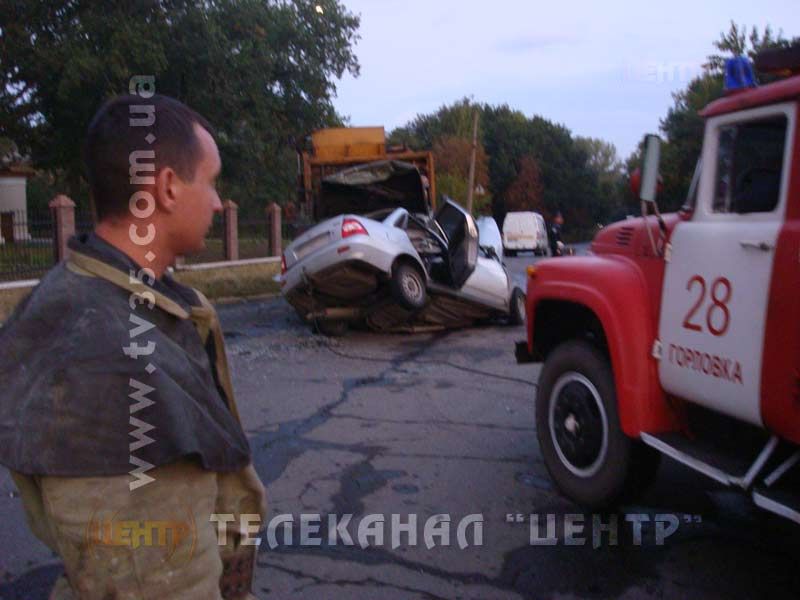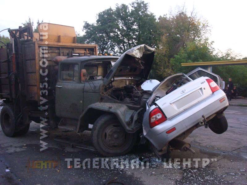 При повороте на Енакиево водитель Lada Priora не справился с управлением, выехал встречную полосу и врезался в мусоровоз. Удар был такой страшной силы, что автомобиль буквально впечатало в грузовик.