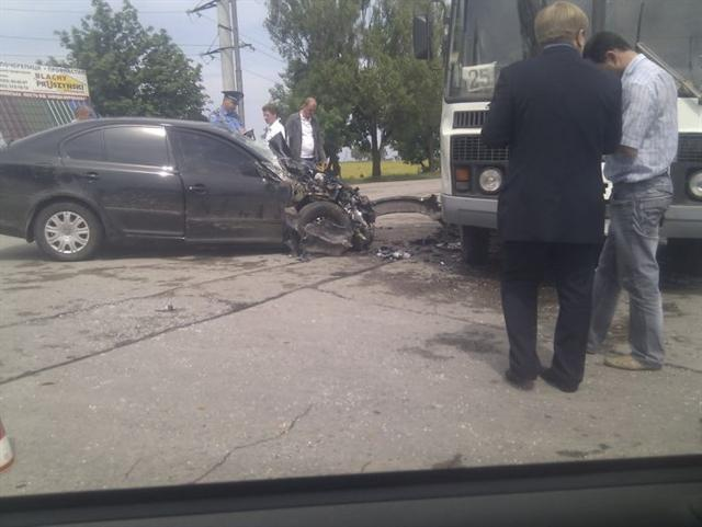 17 мая в Мариуполе на пересечении улиц Олимпийская и Таганрогская не поделили дорогу автобус ПАЗ и автомобиль Skoda. По словам, очевидцев ДТП спровоцировал водитель маршрутки. На повороте он не пропустил иномарку.