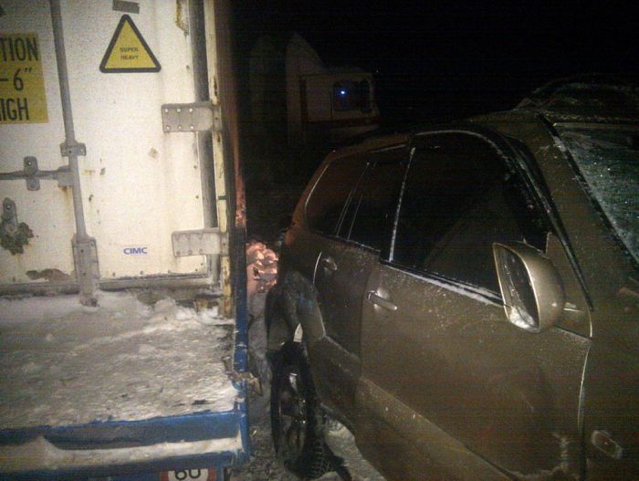 По предварительно версии ГАИ, водитель тягача проигнорировал скоростной режим. В результате он выехал на полосу встречного движения, где и столкнуклся с Toyota Land Cruiser Prado.