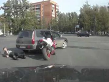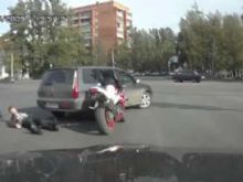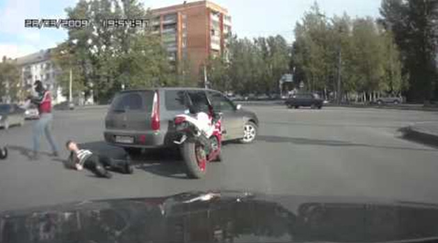 Водитель Mitsubishi Lancer очень лихо всех объехал на перекрестке, и чтобы не мешать встречному транспорту, решил остановиться прямо перед мотоциклистом, сообщает .