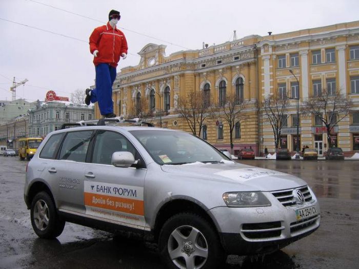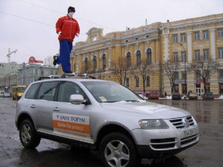 Лишь присмотревшись, можно понять, что на крышах мощных джипов  Хаммер  и Фольксваген Туарег удобно расположились…  манекены, а сами автомобили брендированы. Чтобы не теряться в догадках, сразу объясним – это рекламная БТЛ-акция, которая сейчас проходит в шести крупнейших городах Украины. Она призвана поддержать новый банковский продукт от банка «Форум» (www.forum.ua).