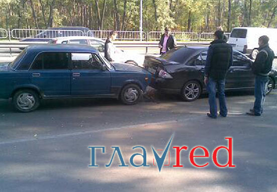 Так, в направлении Броварского проспекта в тянучке ехал автомобиль Mitsubishi. В определенный момент водитель резко остановился и в него въехал ВАЗ. В результате удара у Mitsubishi довольно сильно помята задняя часть, у Жигули в свою очередь разбит передний бампер, радиатор, побиты фары, «повело» капор.
