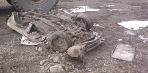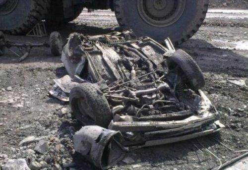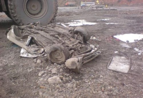 Печальное зрелище... Водителю "БЕЛАЗ" удалось превратить легковушку в лепешку.