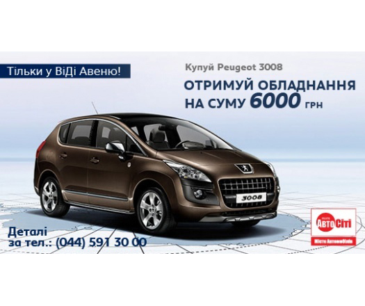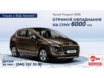 Приобретая этот автомобиль в дилерском центре «ВиДи Авеню» в период действия предложения, помимо скидки в 8 000 грн., на автомобиль Peugeot 3008, Вы получаете приятное дополнение к покупке — дополнительное оборудование на сумму 6000 грн!