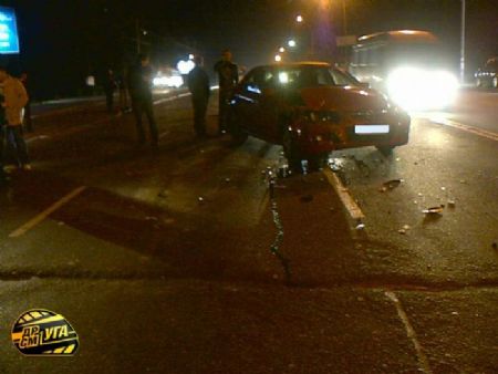 На место ДТП прибыли сотрудники ГАИ, оградили место аварии пластиковыми фишками и начали оформлять ДТП. В это время, по словам очевидцев и водителей других автомобилей, по Харьковскому шоссе в том же направлении двигался Mitsubishi Galant, водитель которого, видимо, вовремя не заметил установленные на проезжей части оградительные фишки. Он резко крутанул влево и подрезал двигавшуюся левее Mazda-3. Водитель «трешки», избегая столкновения с Galant, зацепил передком Daewoo Lanos, который от удара отбросило в припаркованный впереди «жигуленок» ГАИ. Mitsubishi с места ДТП скрылся.