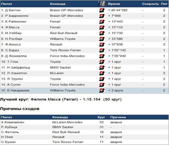 Дженсон Баттон выиграл гонку, одержав пятую победу в шести Гран При, и закрепив лидерство в чемпионате, Brawn GP заработала третий дубль в сезоне. Кими Райкконен финишировал на подиуме, это 58-й подиум в карьере финна и первый после прошлогодней гонки в Бразилии…
