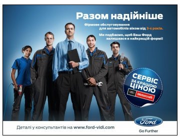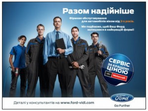У рамках програми Motorcraft Service протягом всього 2015 року Ви можете отримати фіксований перелік послуги за єдиною ціною (включаючи вартість запчастин і робіт) без прихованих доплат. Учасниками цієї програми може стати власник автомобілів Ford віком від 3-х років. Моделі, які приймають участь в програмі: Fiesta, Fusion, С-Max, Focus, Mondeo, S-Max, Galaxy, Kuga, Сonnect. Програма діє на території всієї України. І це ще не все!