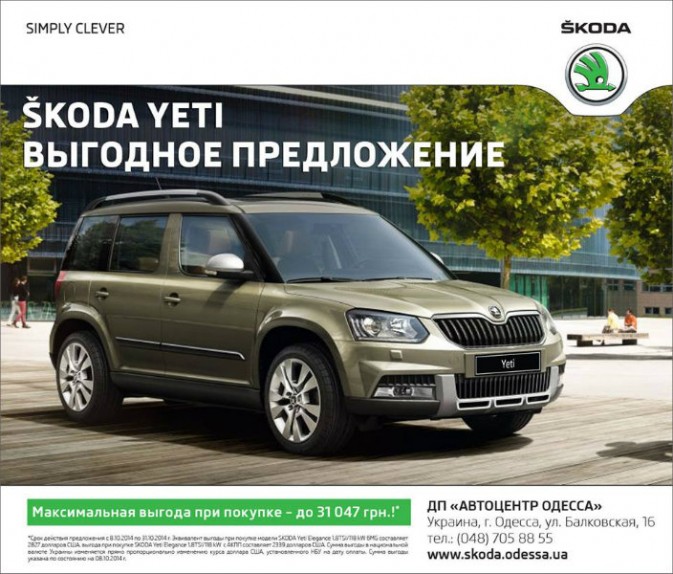 В официальной дилерском центре АВТОЦЕНТР ОДЕССА действует специальное предложение. Только до 31 октября 2014 года автомобили SKODA Yeti предлагаются на эксклюзивных условиях, выгоднее на 31 047 грн!.