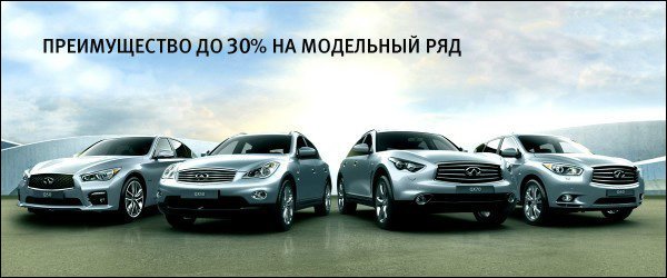 Только до 31.10.2015 года Вы можете приобрести роскошные автомобили INFINITI с выгодой до 30%**. Поспешите воспользоваться преимуществом, ведь количество автомобилей ограничено.