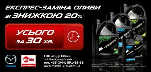 Тільки з 15.10.2015 р.до 30.11.2015 р. дилерський центр Mazda «ВіДі-Скай» пропонує скористатися послугою експрес — заміни оливи за 30 хв. зі знижкою до 20%*.