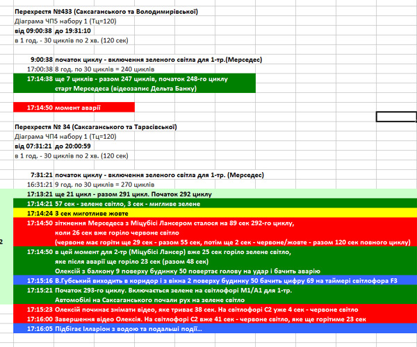 Водночас, за її підрахунками, на світлофорі на Тарасівській на момент проїзду її сина 25 секунд горіло зелене світло, і воно горіло ще 23 секунди після зіткнення.