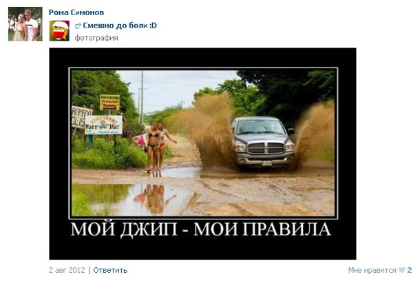 Дотримання правил дорожнього руху – це одна з найпростіших аксіом. Але українські можновладці досі живуть за іншим кодексом "Мій джип – мої правила". Саме такий демотиватор можна знайти на сторінці "Вконтакте" Роми Симонова.