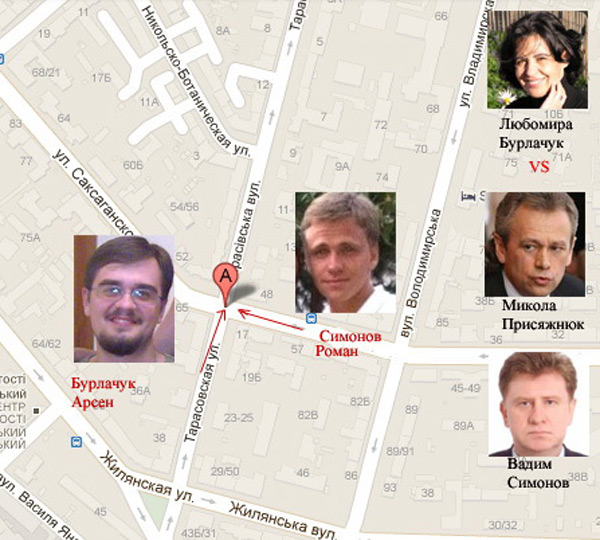 На перехресті Саксаганського і Тарасівської автомобіль Арсена Бурлачука, Міцубісі Лансер, зіткнувся з автомобілем Мерседес-Бенц МЛ350. За кермом останнього, як виявилося, був 19-літній Роман Симонов, племінник міністра АПК Миколи Присяжнюка та син Вадима Симонова, заступника голови Державної ветеринарної та фітосанітарної служби України, начальника Головної Держінспекції по карантину рослин.