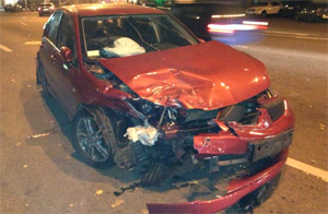 "20 октября 2012 года в 17.15-17.20 я, управляя автомобилем Мерседес, двигался по улице Саксаганского в сторону площади Победы. Ехал я в крайнем левом ряду со скоростью 55-65 км/ч. Пересекая улицу Тарасовскую на зеленый сигнал светофора мой автомобиль столкнулся с автомобилем Митсубиси Лансер, который двигался со значительным превышением скорости на красный сигнал светофора.