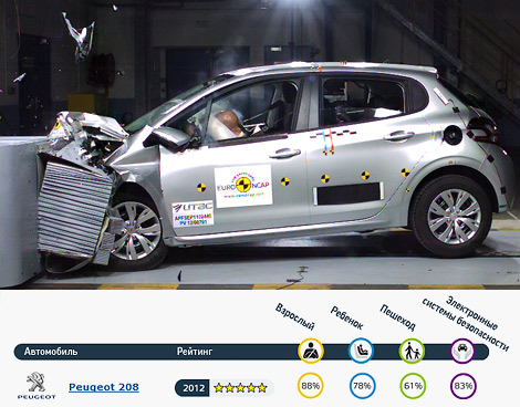 Схожие результаты с CX-5 во фронтальном краш-тесте показал и хэтчбек Peugeot 208, однако при боковом столкновении и ударе о столб опасности подвергается грудная клетка водителя. Кроме того, французский автомобиль стал единственным участником этих испытаний, показавшим минимальную защиту шеи пассажиров при ударе автомобиля сзади.