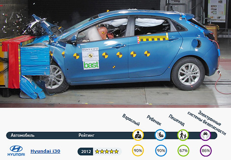У специалистов Euro NCAP не возникло вопросов к безопасности хэтчбека Hyundai i30 при фронтальном ударе, однако защита грудной клетки водителя при имитации удара о столб был признана слабой. Шеи пассажиров при ударе сзади защищены также хорошо, как и в BMW.