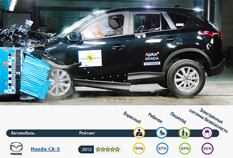 Кроссовер Mazda CX-5 показал наилучший результат среди других трех автомобилей в тестах на боковое столкновение с другой машиной и удар о столб, заработав максимальное количество баллов. По итогам фронтального краш-теста выяснилось, что максимальная безопасность обеспечена переднему пассажиру, а у водителя выявили недостаточную защиту в области грудной клетки и голеней.