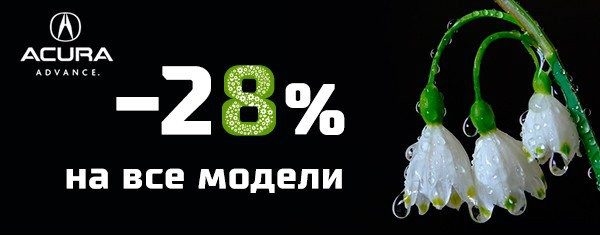 * скидка 28% распространяется на автомобили Acura, количество акционных автомобилей ограничено. Скидка предоставляется с 12 февраля 2015 года до даты продажи последнего акционного автомобиля. Скидка на автомобили предоставляется в ООО «ВиДи Инсайт» по адресу: 08321, Киевская область, с. Чубинское, ул. Киевская 55, 32-й км Бориспольского шоссе, тел.: +38 (044) 591-77-72.