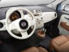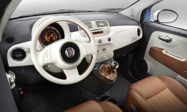 Интерьер автомобиля выполнен в контрастной цветовой гамме, где основные тона повторяют цвета кузова. Сходство с оригинальными Fiat 500 1957 года усиливает коричневая кожаная обивка сидений и никелированные детали в салоне.