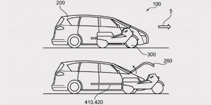 Согласно концепции патента, мотоцикл располагается между сиденьями водителя и переднего пассажира. При этом часть передней панели также является частью самого байка, который, в свою очередь, может быть отделен от машины, выдвигаясь вперед — через отрытый капот.
