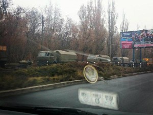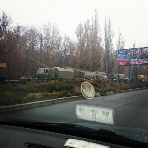 Как сообщают жители шахтерской столицы, конвой состоит из примерно 12 грузовых автомобилей без опознавательных знаков.  На прицепе некоторых грузовиков замечены гаубицы. Сами автомобили тентированые, поэтому определить, что находится внутри ? невозможно.