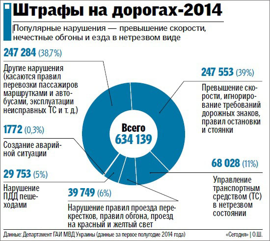 По словам Будника, эксперимент показал, что установленный на аварийно-опасном перекрестке прибор за час зафиксировал 89 нарушений (обычный инспектор оформляет около 5 штрафов за час. — Авт.). Чаще же всего за первые 6 месяцев 2014-го украинцев штрафовали за быструю езду и пьянство за рулем (подробнее см. инфографику. — Авт.).