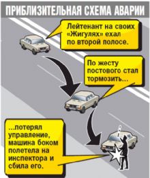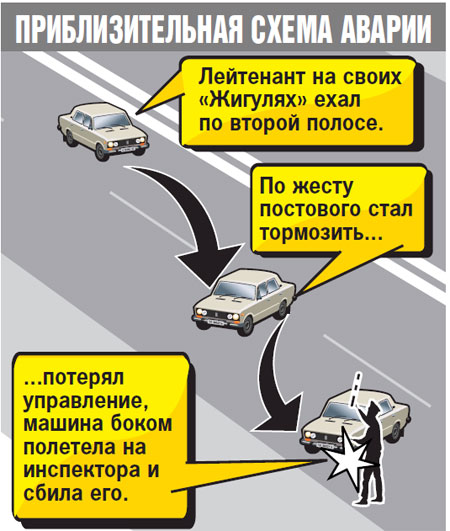 Водитель нажал на тормоз, но машину развернуло поперек дороги и понесло боком. В итоге «Жигули» сбили одного из стоявших там гаишников, который с травмами головы, живота и грудной клетки попал в «неотложку».