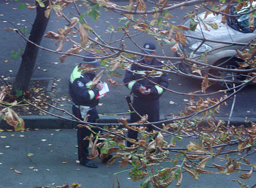 Следующие нарушители спрятались недалеко от первых — в районе станции метро «КПИ». Они с «ВИЗИРом» в руках пристроились за вывеской на столбе, так что видны были только их ноги (нарушения два: первое — «ВИЗИР» нельзя держать в руках, прибор должен размещаться на штативе, второе — прячутся). Через несколько минут, увидев, что мы их фотографируем, гаишники ретировались. Но спустя час эту же машину мы засекли неподалеку от первоначального места базирования. Припарковав автомобиль, один из инспекторов спрятался под дерево с густой листвой и, держа в руках «ВИЗИР», направил его на дорогу. После того как патруль попал в объектив «Сегодня», инспекторы снова быстро уехали. Получить от них пояснения, почему нарушают инструкции, мы вновь не смогли. Только один из засеченных нами патрулей четко соблюдал инструкции, правда, инспекторы были без «ВИЗИРа». В департаменте ГАИ нам сообщили, что сотрудникам, нарушающим инструкцию, грозит выговор и даже увольнение. Но это не касается тех, кто держит «ВИЗИР» в руках, поскольку, по словам начальника пресс-службы Департамента ГАИ Нины Хмелевской, они пока еще не закупили штативы для всех приборов.