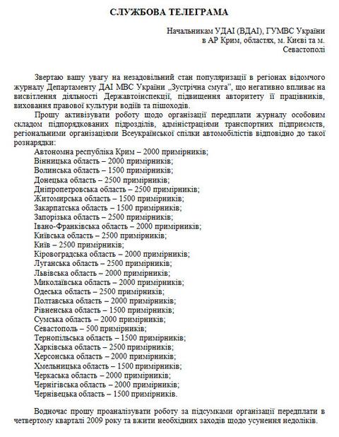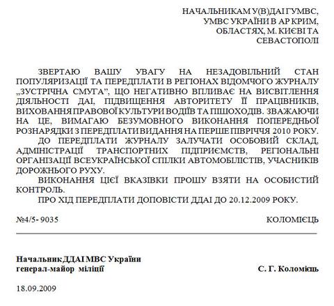 После новогодних праздников упомянутое «пособие» опять напомнило о себе. Его за 90 гривен пришлось приобрести в одном из МРЕО (межрайонном регистрационно-экзаменационном отделении) ГАИ в соседней с Киевской области, где знакомый вашего корреспондента попытался снять с учета автомобиль, принадлежащий больному отцу. В «конторе» рядом с окошком приема документов стопками лежали десятка три таких книжек и рядом журналы «Зустрічна смуга». Что самое интересное, сидящий за стеклом упитанный майор начинал разговор только с теми, кто, выложив наличными указанную сумму, соглашался приобрести книжонку или несколько номеров упомянутого журнала.
