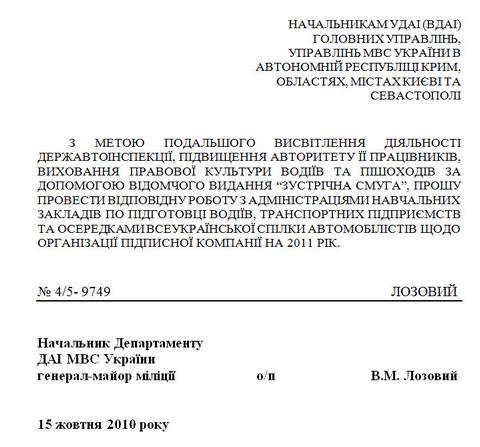 Как ни странно, на проторенную стезю соскользнул и нынешний главный ГАИшник страны Валерий Лозовой: в конце прошлого года увидела свет выпущенная под его редакцией брошюрка «На поличку водія «ДТП: що робити?». Все бы ничего, если бы ни одно «но»... Как и в прежние годы честь воплотить и реализовать очередной генеральский бизнес-проект среди водителей была дарована работникам низовых подразделений ГАИ областей, городов и районов.