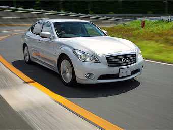 Седан Infiniti M35h оснащен гибридной силовой установкой, сочетающей в себе 306-сильный шестицилиндровый двигатель объемом 3,5 литра, 68-сильный электромотор, литий-ионные аккумуляторы и семиступенчатую автоматическую коробку передач. С нуля до "сотни" такая машина разгоняется за 5,9 секунды, а расход топлива в смешанном цикле составляет 7,3 литра на сто километров пробега.