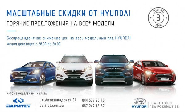 Автоцентр «ПАРИТЕТ» рад сообщить Клиентам приятную новость: только три дня на весь модельный рядавтомобилей HYUNDAI действуют специальные акционные цены!.