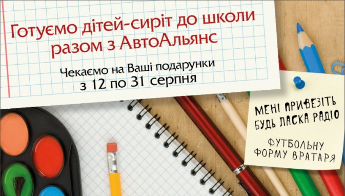 Сотрудники «АвтоАльянс Киев» собирают все необходимое детям и приглашают Вас сделать доброе дело для тех, кто пока не может сам о себе позаботиться. С 15 по 31 августа Ваши подарки очень ждут в автоцентре «АвтоАльянс Киев», Подол, ул. Корабельная, 4А, а 1 сентября сотрудники компании отвезут их детям-сиротам в с. Удайцы Черниговской области.